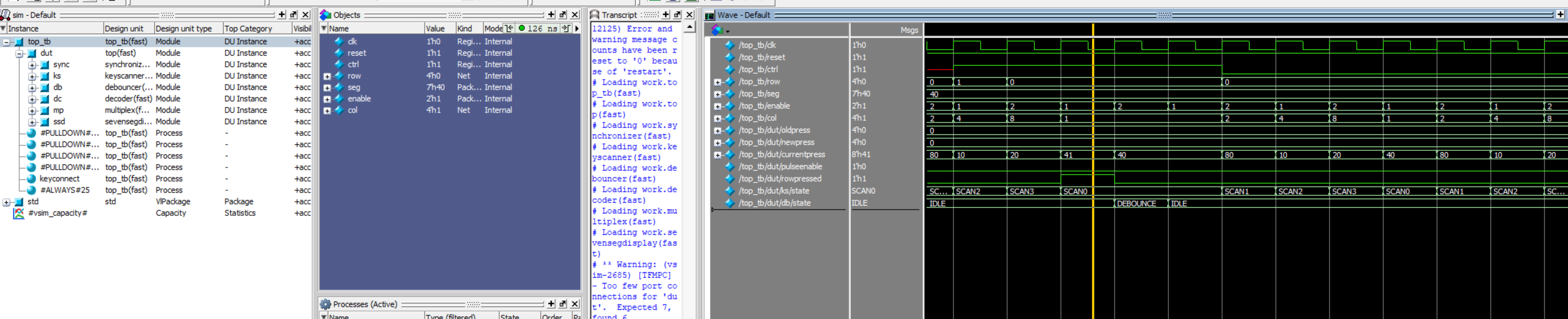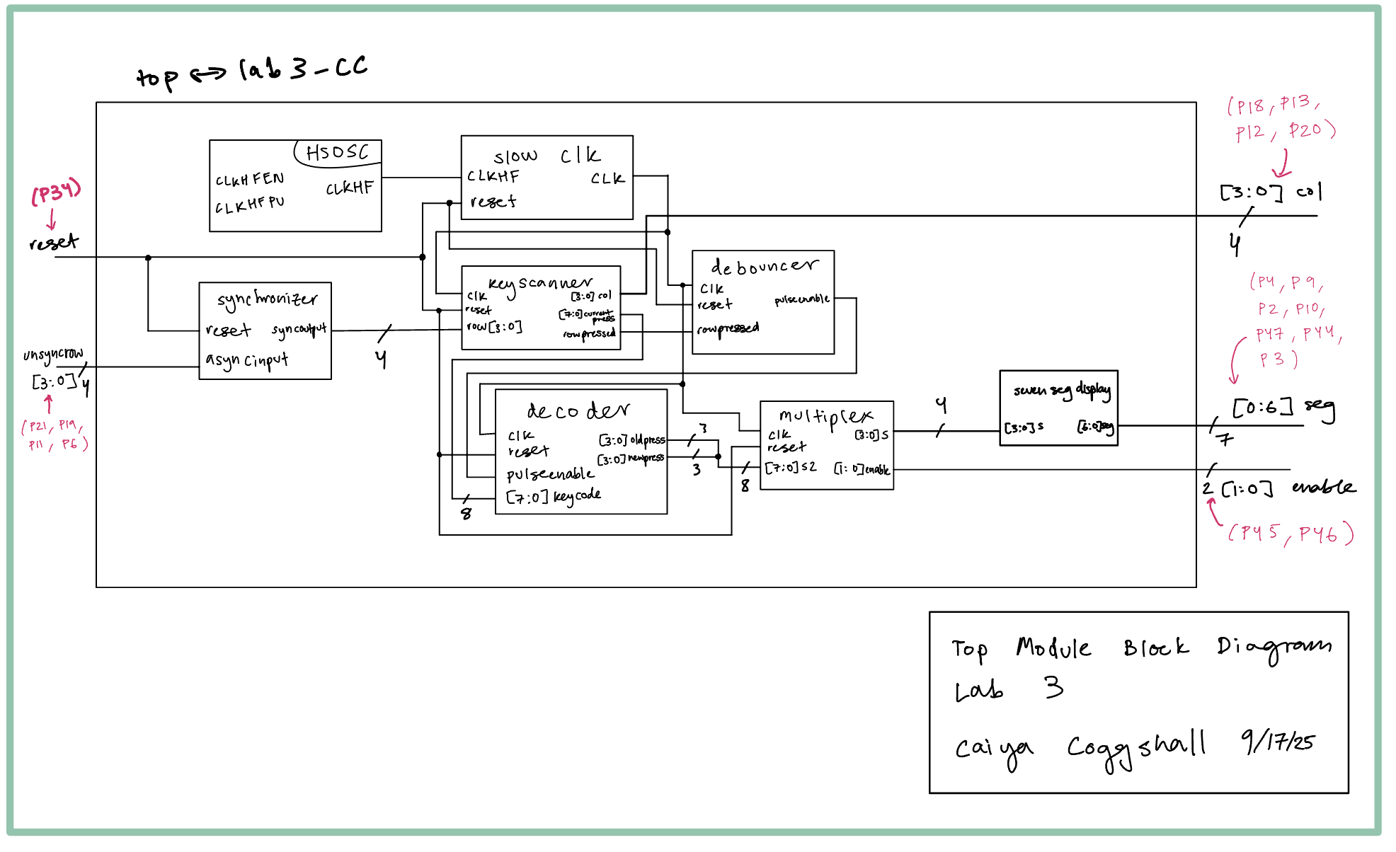 The block diagram in Figure 2 demonstrates the overall architecture of my design. I had eight main modules, two fsms (one for column scanning and one for debouncing), one for decoding (i.e translating a column row encoding to a binary bits representing a number on the keypad & updating the new press), one to synchronize the code, one as a slow clk to slow down the high speed oscillator, one for my multiplexer code (i.e choosing which input and power to turn on), one for my seven segment code (i.e telling which segments to light up based on input), and the top module containing everything as well as the high speed oscillator.