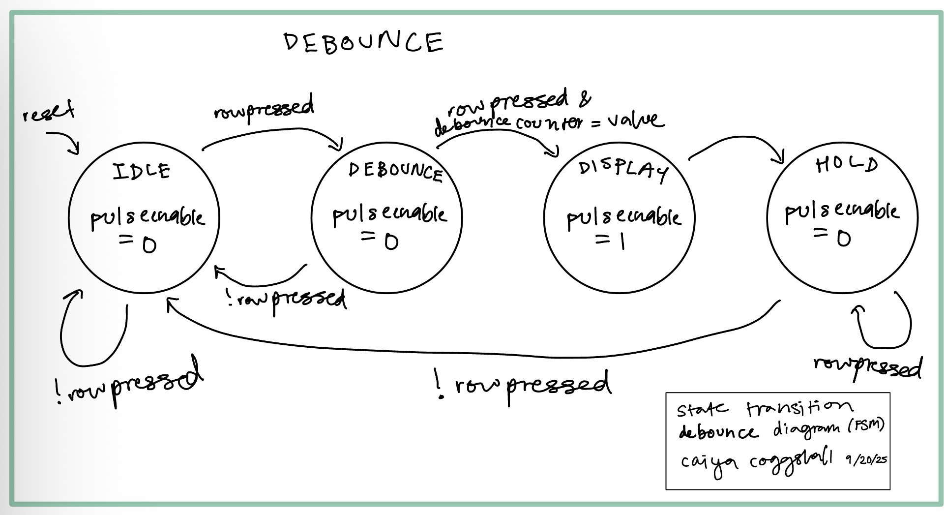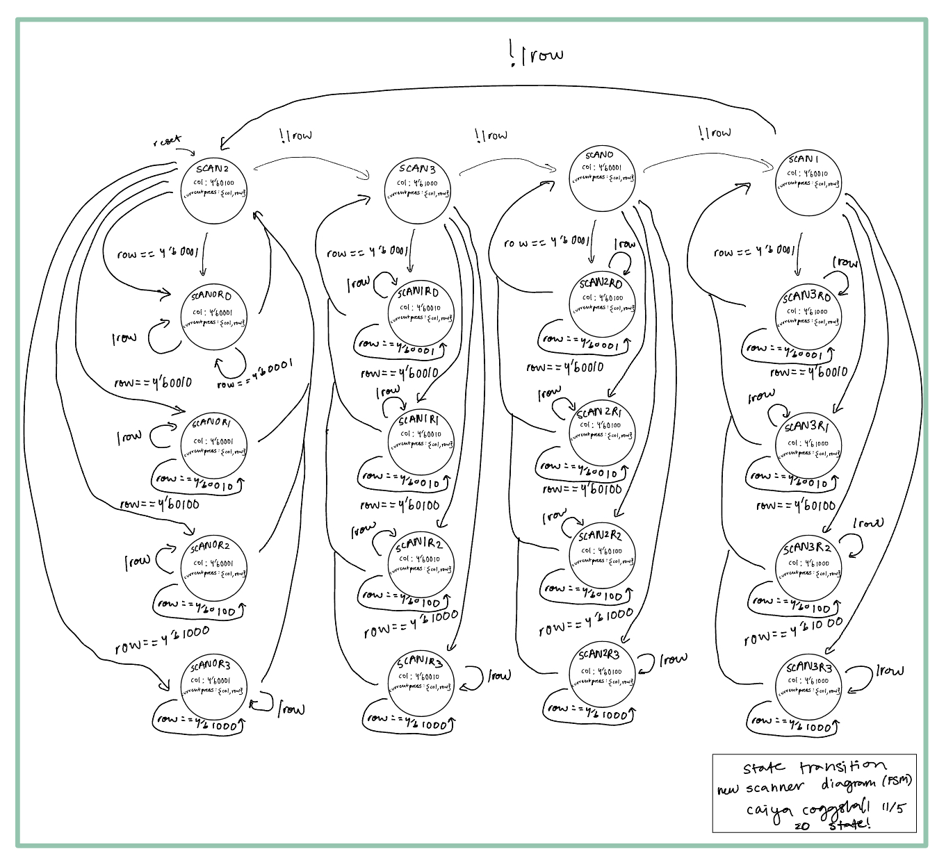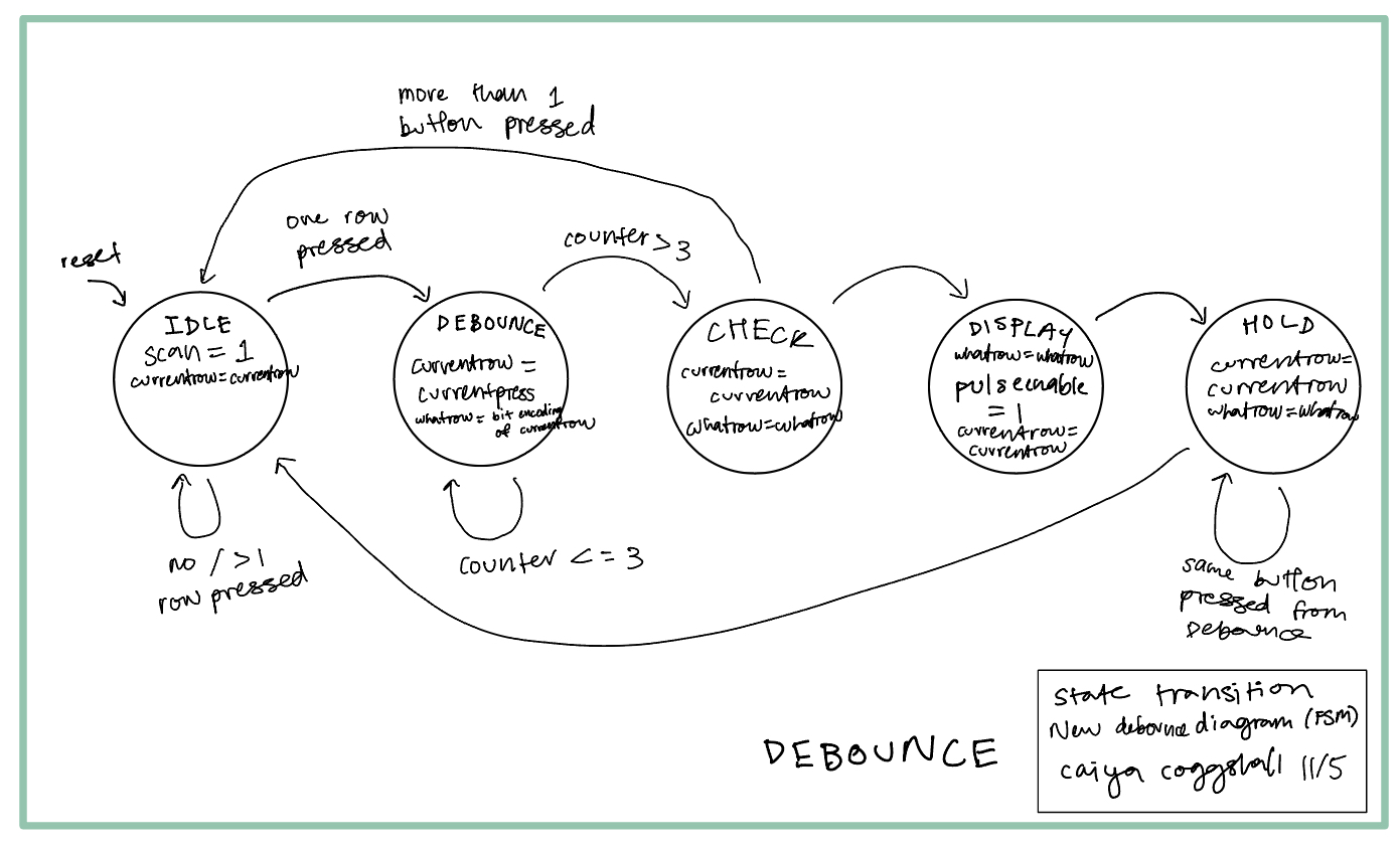 I mostly made changes to my keyscanner.sv and debouncer.sv files. One thing I needed was neq logic in my HOLD state because something was allowing me to release my button press and register new ones when I still had something held down. This is because the holdstate was only checking if rowpressed = 1. rowpressed was all the rows or’d together so 4 input which I’m still unsure how it was able to bypass but one thing I needed to change was in certain areas making that OR an XOR so that it was only true when 1 of the inputs was on. After changing some of my logic, I was able to get my code to not register other presses unless you were in same column. Part of this was that I didn’t have logic that was checking that. Rows are inputs so I was powering each column and so if a column was on, I didn’t have any logic to prevent it from taking in other presses. This was a relatively simple fix by adding in an else if statement for other presses in the SCAN state (the path to figuring this out was not easy). Except, adding in this logic meant that if you held down on a button in a column and pressed down on a second button (in the same column) and released the first button again it wouldn’t register that second button which was a spec!) because it had logic rejecting that. This is when I started messing with my debouncer logic. I added in a CHECK state as well as storing the exact row index and value of the row/column immediately upon detection of the press. The always_ff would then continue to store those same values until it detected that key to be lifted. Then in the HOLD state, it wouldn’t go back to the IDLE scanning state unless the current key that was being pressed was the same as the one it stored at the first press of the FSM. The new debouncer FSM can be found below: