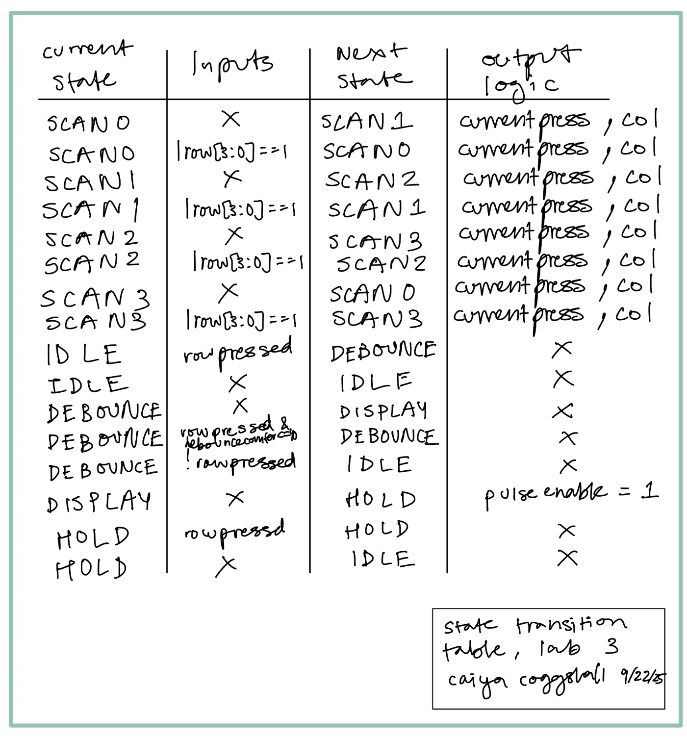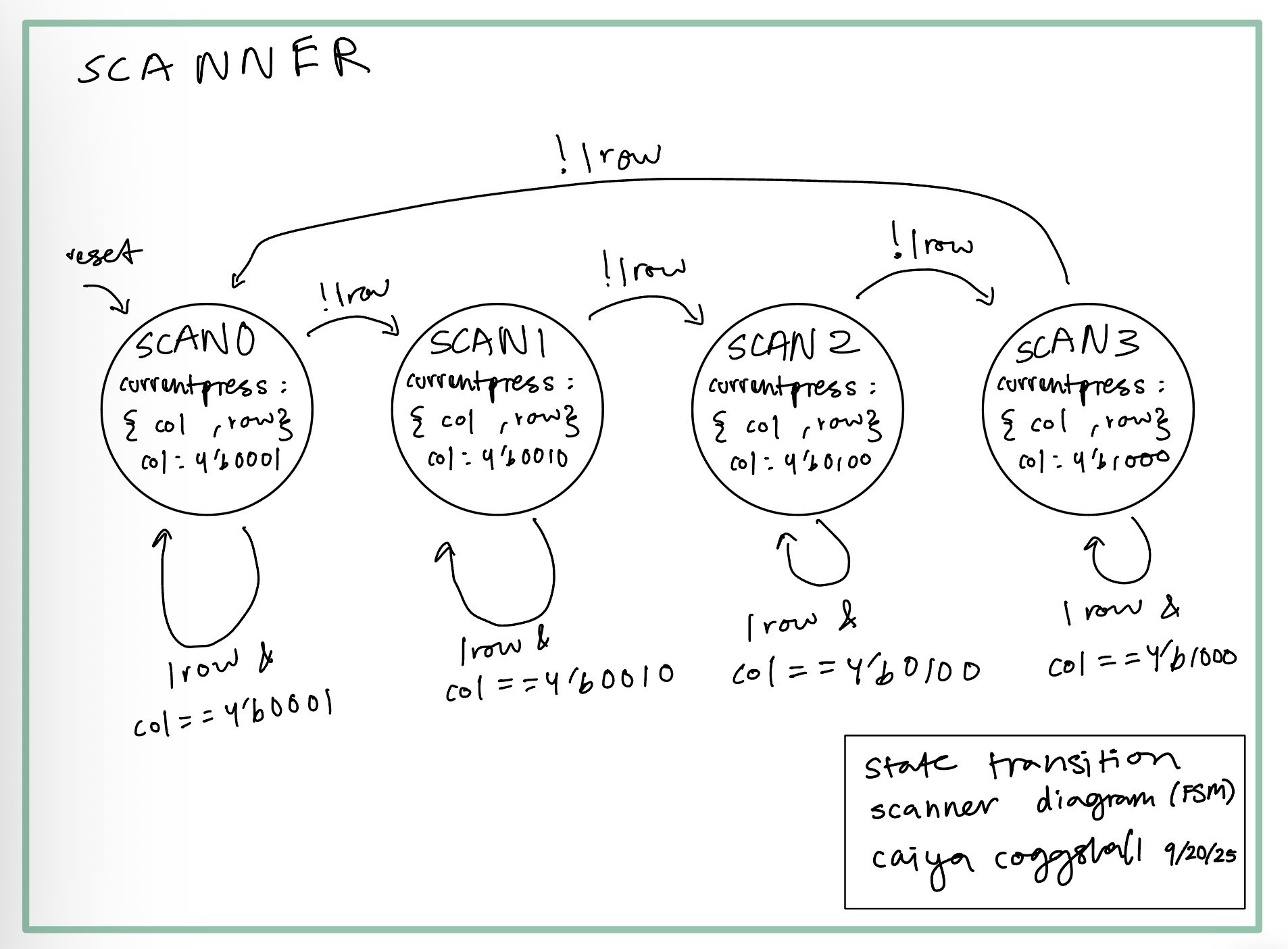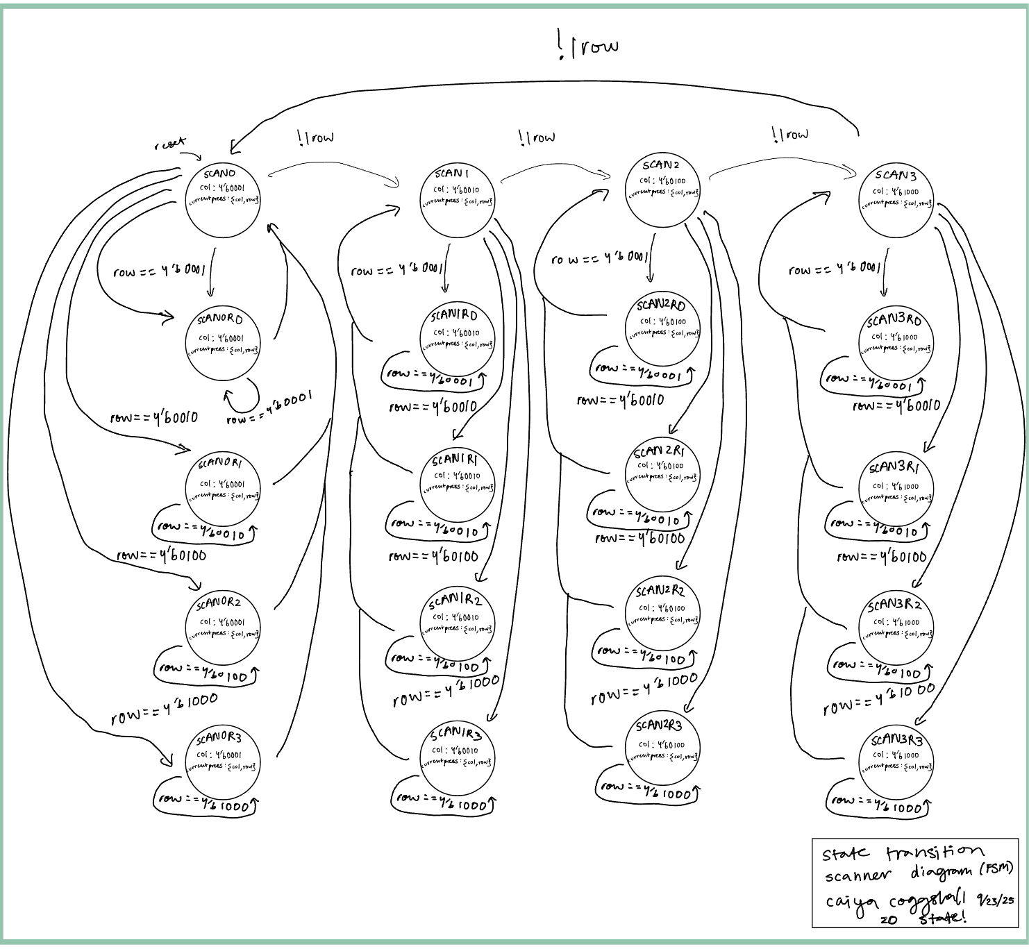 I mostly made changes to my keyscanner.sv and debouncer.sv files. One thing I needed was neq logic in my HOLD state because something was allowing me to release my button press and register new ones when I still had something held down. This is because the holdstate was only checking if rowpressed = 1. rowpressed was all the rows or’d together so 4 input which I’m still unsure how it was able to bypass but one thing I needed to change was in certain areas making that OR an XOR so that it was only true when 1 of the inputs was on. After changing some of my logic, I was able to get my code to not register other presses unless you were in same column. Part of this was that I didn’t have logic that was checking that. Rows are inputs so I was powering each column and so if a column was on, I didn’t have any logic to prevent it from taking in other presses. This was a relatively simple fix by adding in an else if statement for other presses in the SCAN state (the path to figuring this out was not easy). Except, adding in this logic meant that if you held down on a button in a column and pressed down on a second button (in the same column) and released the first button again it wouldn’t register that second button which was a spec!) because it had logic rejecting that. This is when I started messing with my debouncer logic. I added in a CHECK state as well as storing the exact row index and value of the row/column immediately upon detection of the press. The always_ff would then continue to store those same values until it detected that key to be lifted. Then in the HOLD state, it wouldn’t go back to the IDLE scanning state unless the current key that was being pressed was the same as the one it stored at the first press of the FSM. The new debouncer FSM can be found below: