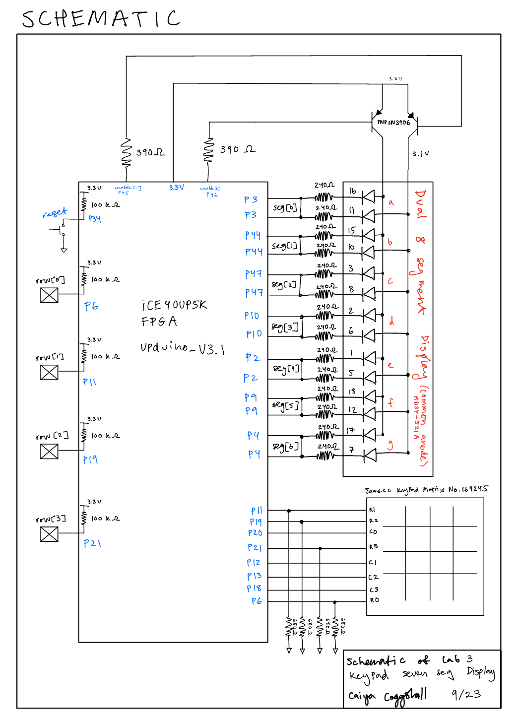The schematic as seen in Figure 3 shows the layout of the circuit design. It has 4 GPIO pins routing to the FPGA as the input rows with pulldowns of 680 Ohms and an internal 100 kΩ pullup resistor to make sure the active low reset pin doesn’t float. The output LED and PNP transistors were connected to a current limiting resistor to make sure the output current didn’t exceed the max output current of the FPGA I/O pins. With the connection from the FPGA to the Dual Seven Segment Display, I could have wired the board with only 7 resistors and it would have worked just as well but this method was slightly more intuitive and so what I choose to go with. Refer to Figure 1 for resistor calculations. Compared to lab 2 I additionally had a keypad where I looped through the columns and had inputs of the rows.