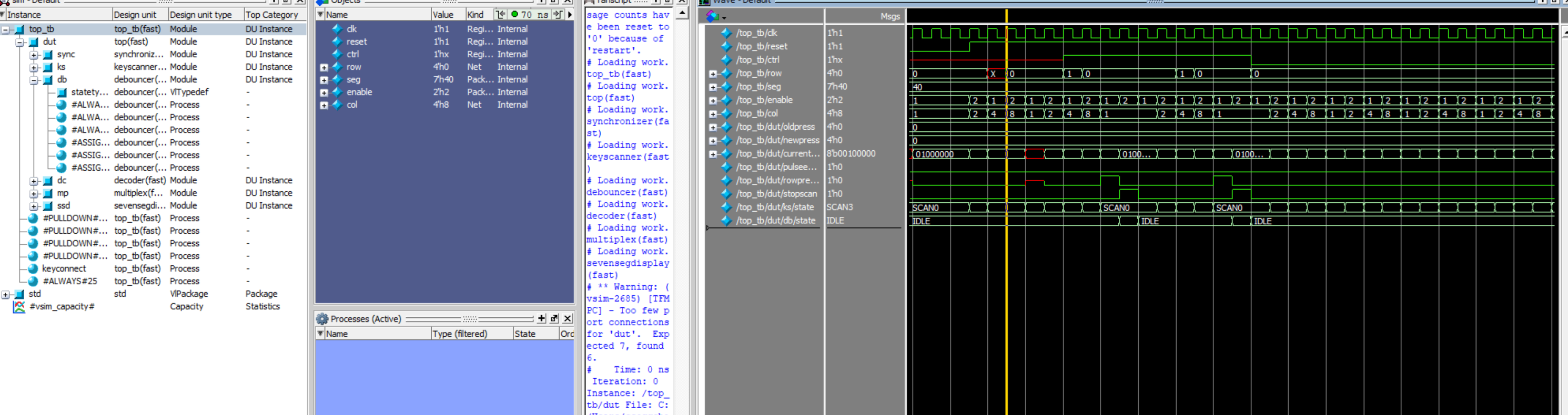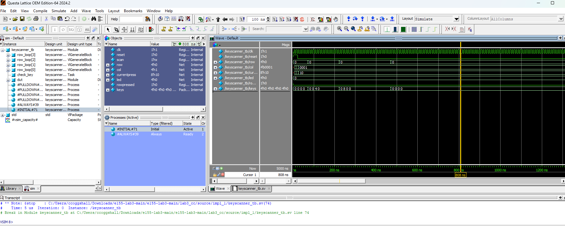 In this lab I built off of Lab 2 to implement a time-multiplexing keypad scanner to drive two seven-segment displays using the same seven-segment decoder HDL module and set of FPGA GPIO pins. When a key was pressed, the design would indicate that it was pressed and record that number on the right of the dual seven seg display. Once another button was pressed, the previous digit would shift to the left hand place and the new digit would fill the right.