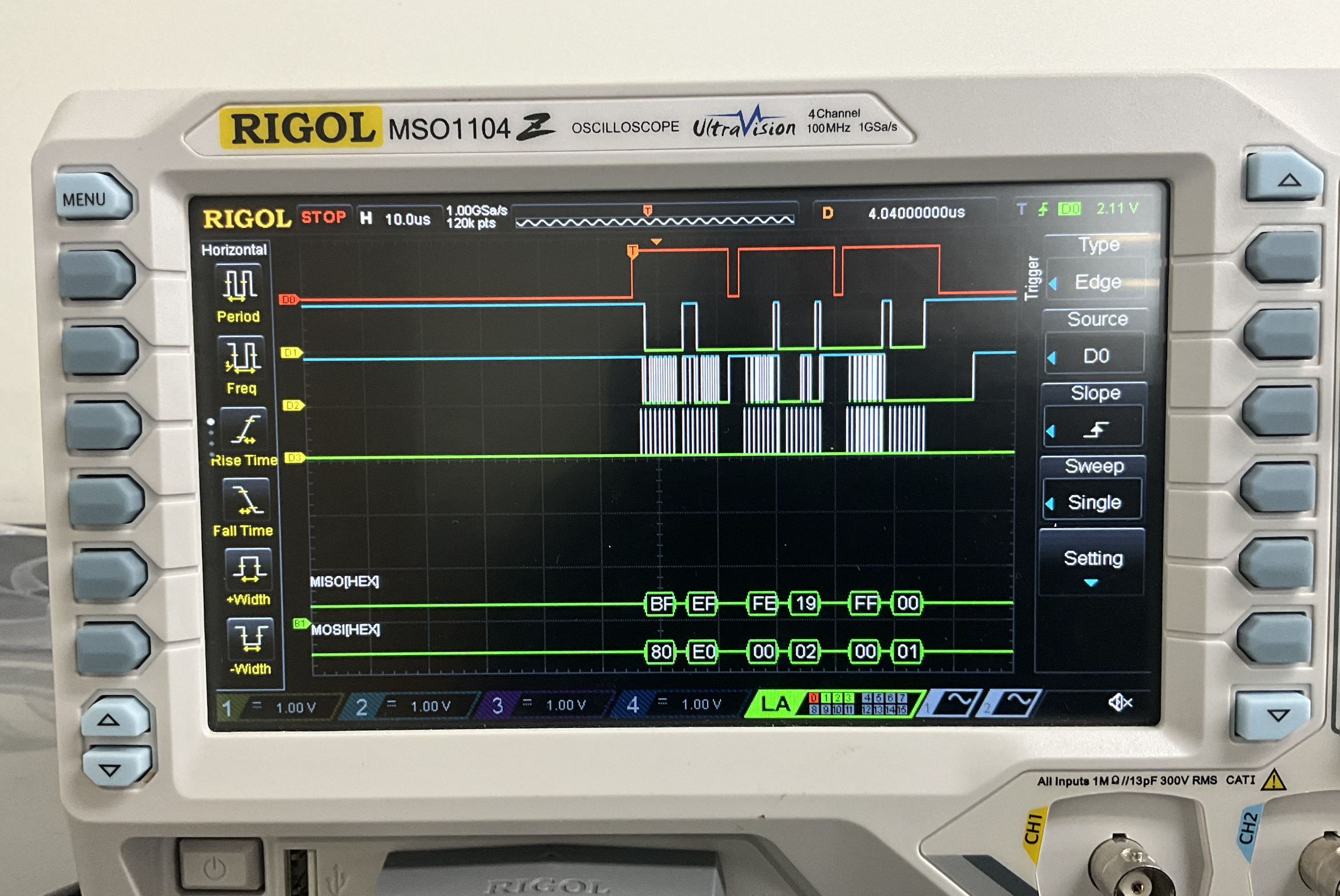 This was quite hard to set up on the oscilloscope and I watched the tutorial video 3 times over before I got it. A frustrating feature was that the MISO/MOSI values would change with horizhontal scaling or just between traces. A couple hypotheses is that if the LED is on then those addresses are interferring because the LED turns off automatically when setting a resolution. Another is that scaling affects resolution and accuracy of the trace which would reasonably translate to what it’s able to capture.